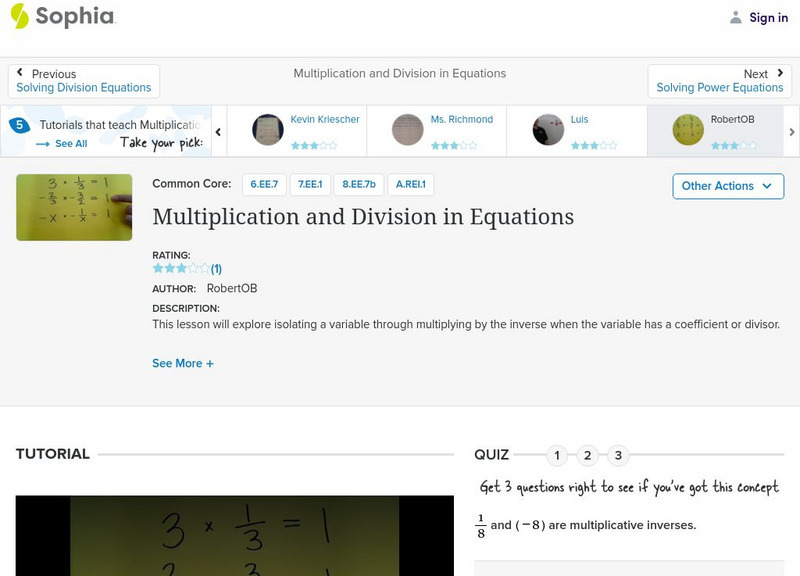 This lesson will explore isolating a variable through multiplying by the inverse when the variable has a coefficient or divisor. It is 3 of 8 in the series titled "Multiplication and Division in Equations."