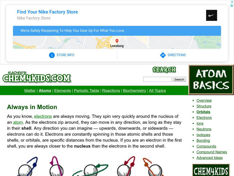 The website provides an explanation of the electrons' position in their orbitals as they spin around the nucleus. Quantum theory is also explored by explaining that the exact location of a specific electron is a not exact but a guess.