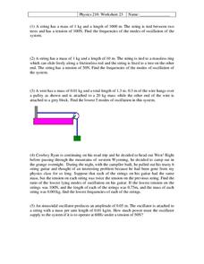 In this harmonic motion worksheet, students find the speed of a wave. Students determine the period, frequency, and equilibrium position of a pendulum. This worksheet has 13 problems to solve.