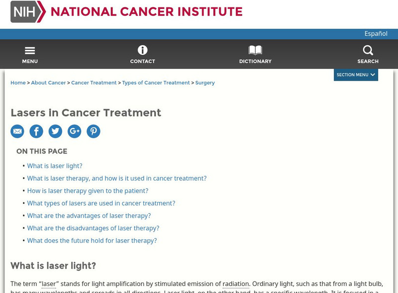 This site discusses the different uses for lasers in medicine. It provides specific details on the uses of lasers in treating cancer. Also contains links to definitions of many of the terms used througout the site.