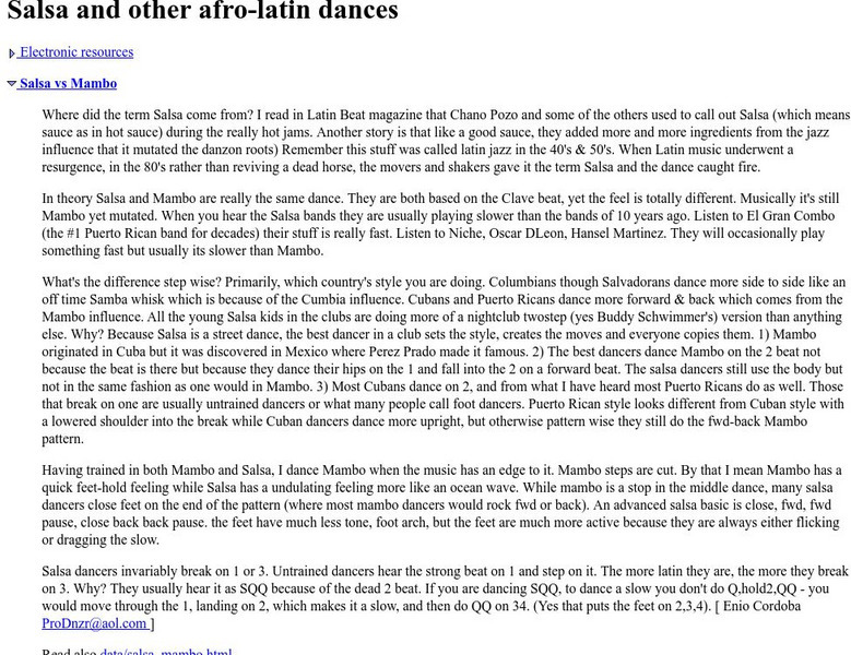 An article discussing the similarities and differences between Salsa and the Mambo, both Latin American dances. The article mainly discusses the steps of both dances, but has some information about the style and feel of the music.