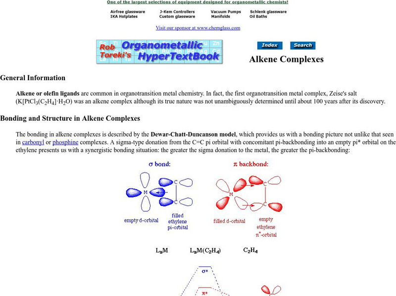 A summary of alkene complexes formed with transition metals. Includes information on hybridization and synthesis.