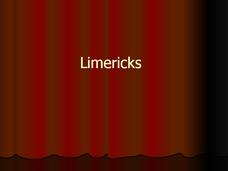 Students explore limericks. In this poetry writing lesson, students listen to and read a variety of poems written by Edward Lear. Students count syllables and identify meter by clapping as they read aloud. Students complete a limerick...