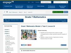 Discover the difference between the capacity of a container and its volume. The 25th part of a 28-part series presents problems that require pupils to determine the amount of liquid a prism can hold. Learners must take into account the...