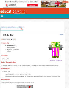 Youngsters engage in a relay race where they dip a sponge in water, run to a bucket, and squeeze out the sponge. They have five minutes to take turns transporting water to the goal. Whey the time is up, each team measures the total...