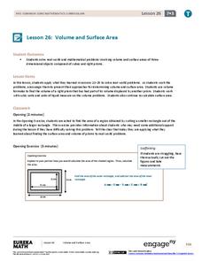 The 26th part of a 28-part series requires pupils to determine whether the answer to a problem requires surface area or volume. The class works problems about fish tanks that prompt individuals to decide, based on the question, which...