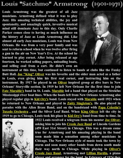 This site from Red Hot Jazz contains a good biography of Louis Armstrong, arguably the most influential jazz musician. Very interesting and informative, also includes a picture.
