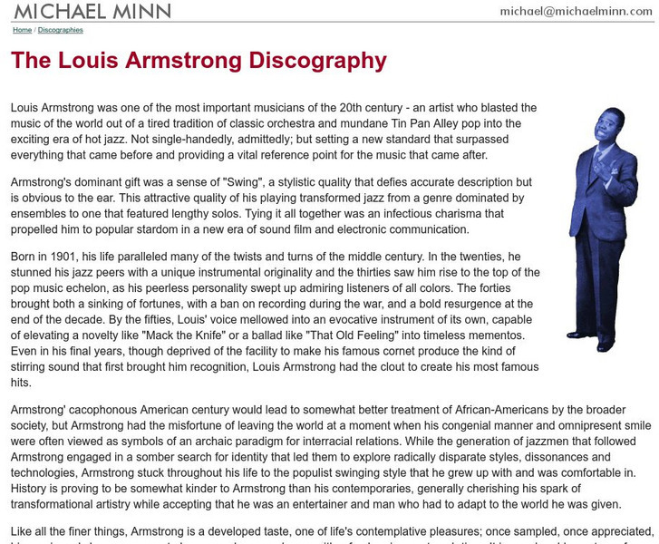 Venture into the vast recording career of the father of jazz, Louis Armstrong(1901-2001 CE). This site lists in detail many of the recordings made by Satchmo.