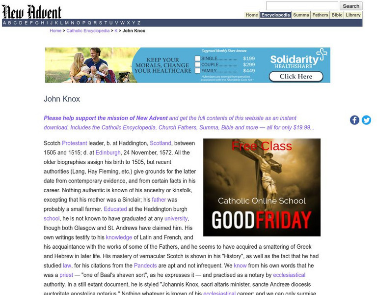 This website, rom the Catholic Encyclopedia, describes the life and history of the Scottish preacher, John Knox. Includes his early life at Edinburgh, his geneology, and his ecclesiastical rise to prominence as a reformer. Knox was a...