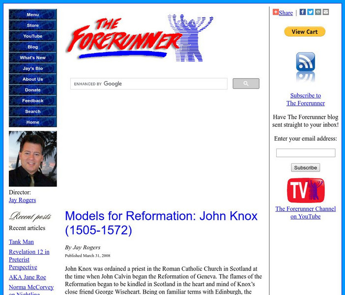 This website gives a brief, biographical sketch of the life of Jonn Knox, Scottish clergyman, who set the tone for Reformation of the Church in the Renaissance Period. Knox was known, among other things, for his stand against the...