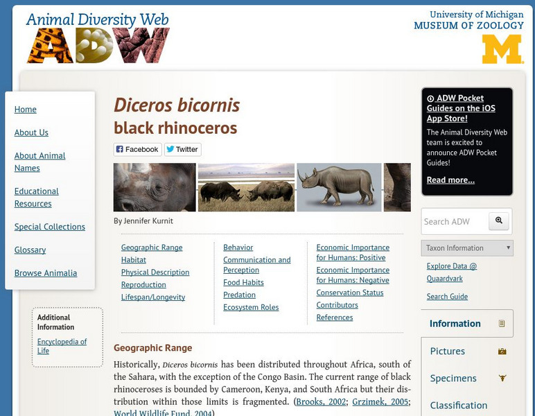 Comprehensive reference material on the black rhinoceros, with information about physical characteristics, geographic range, diet, reproduction, behavior, and habitat.