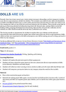 Representation matters! A lesson plan examines the looks of dolls and discusses whether the design is inclusive or not. Scholars create a paper doll representing a characteristic about themselves or highlights another diverse quality....