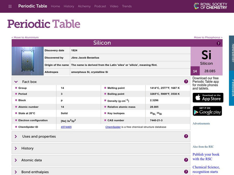 Here you can find some great information about the 14th element in the periodic table, "silicon." Content focuses on silicon's electrons, where you can find silicon in nature and in the home, and how silicon combines with other elements.