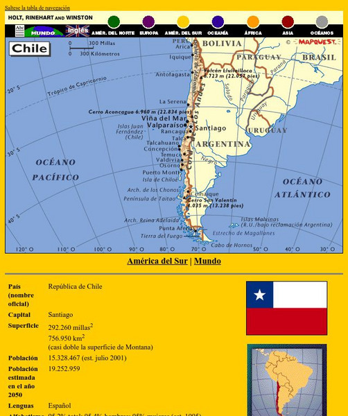 This site has a map of Chile in Spanish, with informational data also presented in Spanish about the country. Land mass, population, life expectancy, literacy, industry, agriculture, minerals and resources are among the topics addressed....