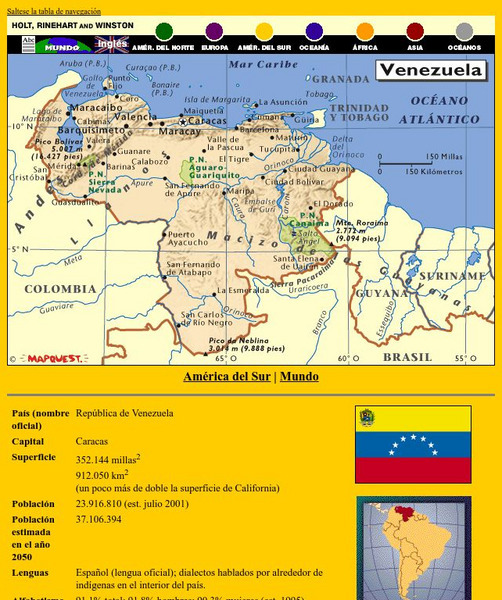 This site has a map of Venezuela in Spanish, with informational data also presented in Spanish about the country. Land mass, population, life expectancy, literacy, industry, agriculture, minerals, and resources are among the topics...
