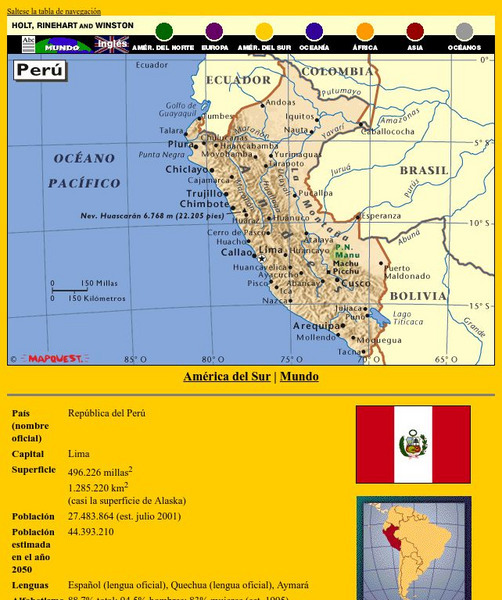 This site has a map of Peru in Spanish, with informational data also presented in Spanish about the country. Land mass, population, life expectancy, literacy, industry, agriculture, minerals and resources are among the topics addressed....