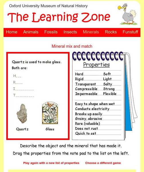 A simple activity where you must choose the properties that describe both the mineral and an object made from it. The activity can be played with new sets of minerals, objects, and properties.