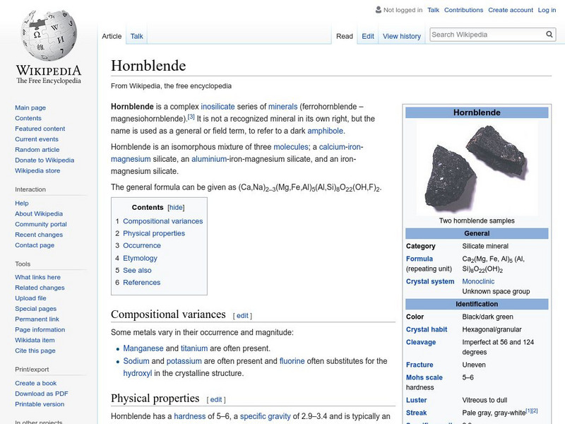 Wikipedia offers a description of the mineral Hornblende including specific gravity, hardness, and image.