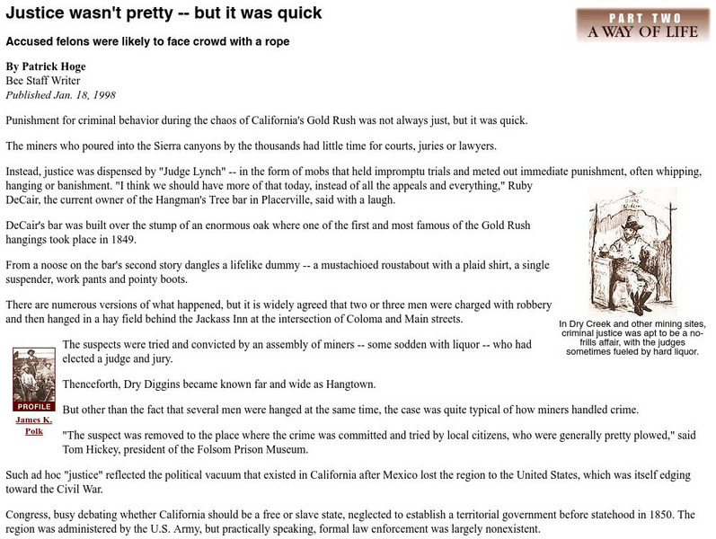 This CalGoldRush.com site contains information on justice and law in California during the gold rush. Many felons lost their lives at the end of a rope.