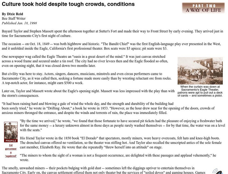 This resource contains information on the development of culture in California during the gold rush. Culture developed in spite of the harsh conditions and tough people.