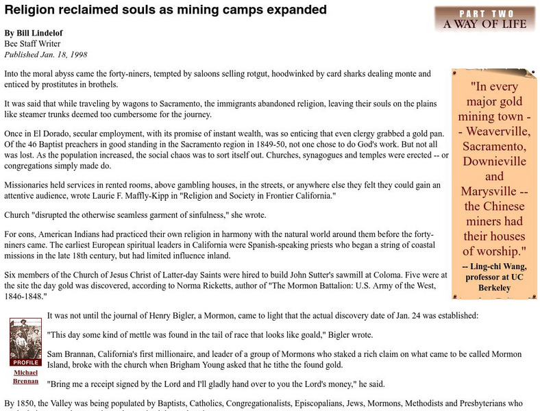 This article, entitled "Religion Reclaimed Souls as Mining Expanded," contains information on the developement of religion in California during the gold rush.