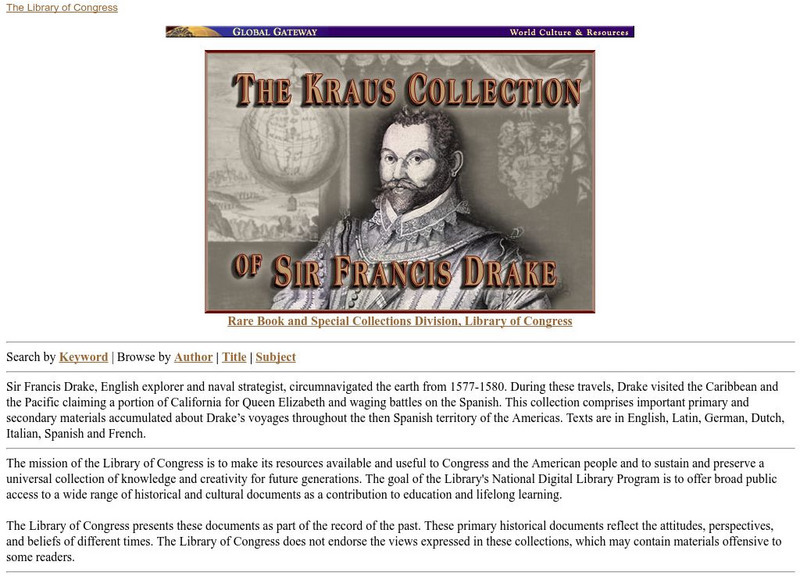 From the rare book and special collections of the Library of Congress, presents important primary and secondary source materials by and about Sir Francis Drake.