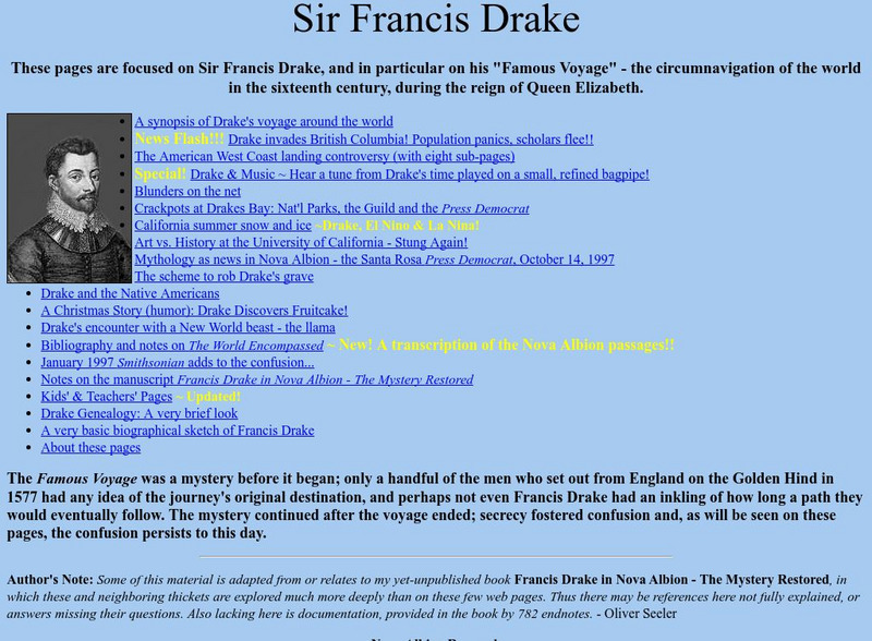 Extensive information about Sir Francis Drake and his voyage around the world in the 16th century.