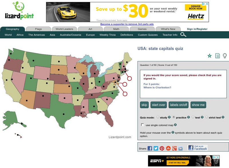 Test your knowledge of U.S. and world geography. Five levels of games challenge players to identify states, capitals, and countries.