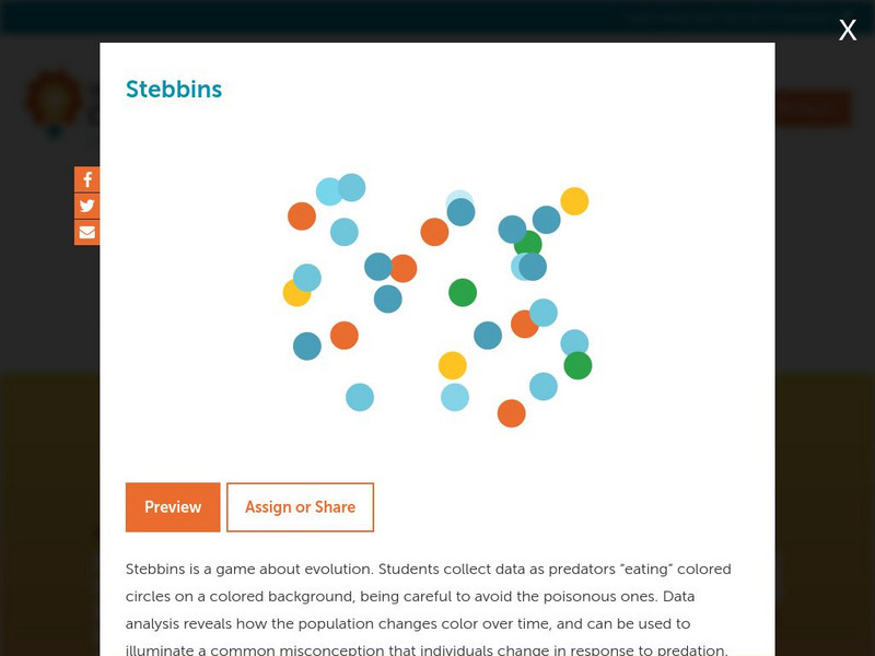 Stebbins is a game about evolution. Students collect data as predators eating colored circles on a colored background, being careful to avoid the poisonous ones. Data analysis reveals how the population changes color over time, and can...