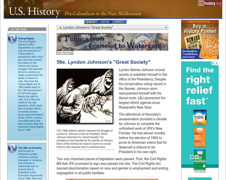 Providing photos, audio clips, primary texts, a timeline, and a glossary, this website is a good introduction to President Lyndon Johnson's efforts to reform education in the United States. Listen to (or read) Johnson's "Great Society...