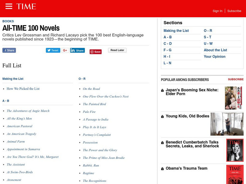 Time magazine presents its picks for the top 100 best English-language novels from 1923 to the present. It includes some original reviews.