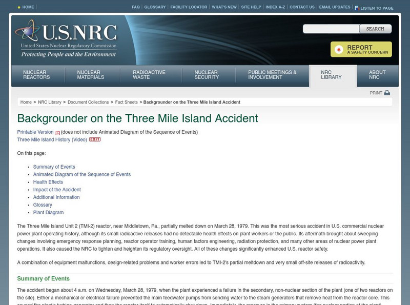 Learn about what happened at Three Mile Island Nuclear Power Facility in March of 1979 with this PBS site. A teacher's guide is available.