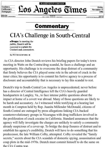 This commentary from the Los Angeles Times discusses the connection between the Contras and drug trafficking.