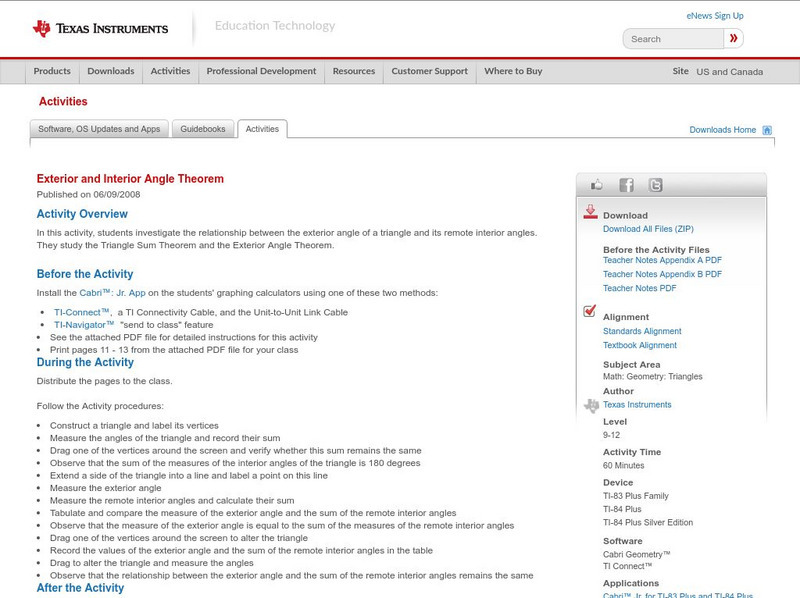 In this activity, students investigate the relationship between the exterior angle of a triangle and its remote interior angles. They study the Triangle Sum Theorem and the Exterior Angle Theorem.