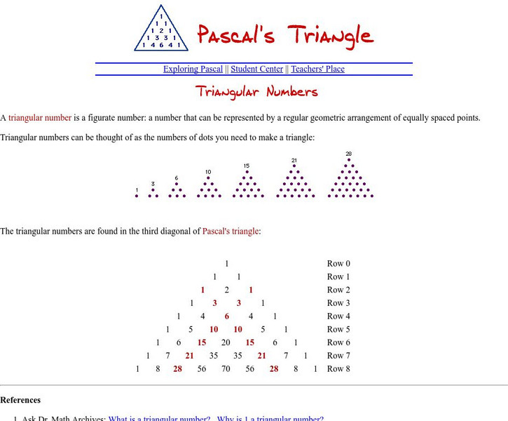 Patterns of numbers don't come along every day, and so when they do, they need to be bragged about! The basic definition of triangular numbers begins this site which also lists many of the properties of these numbers, highlights the...
