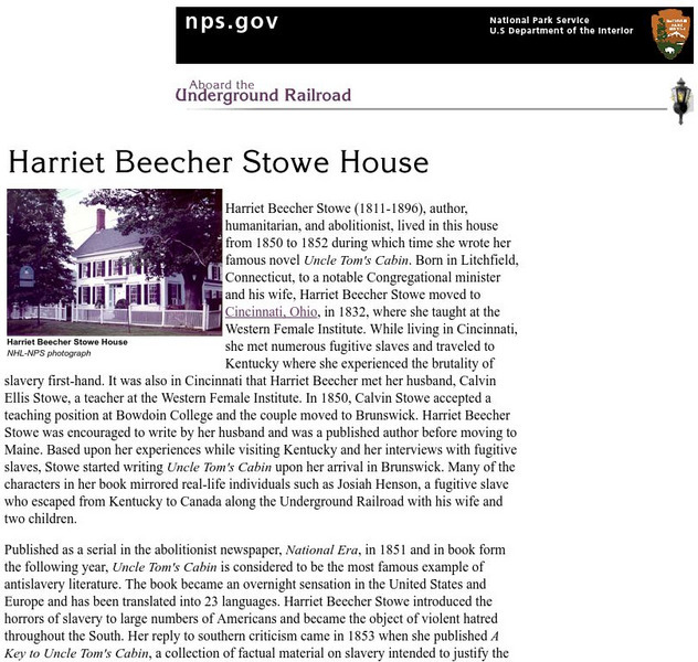 This 'Aboard the Underground Railroad' site provides a short outline of Stowe's life and work.