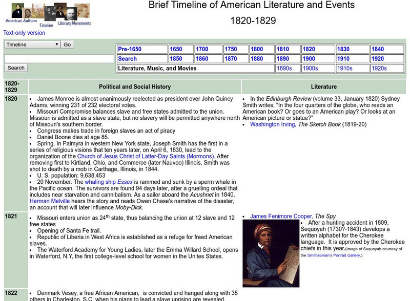 A timeline of political and social events and American literature. Part of a larger site. Hyperlinks to information about individual authors.
