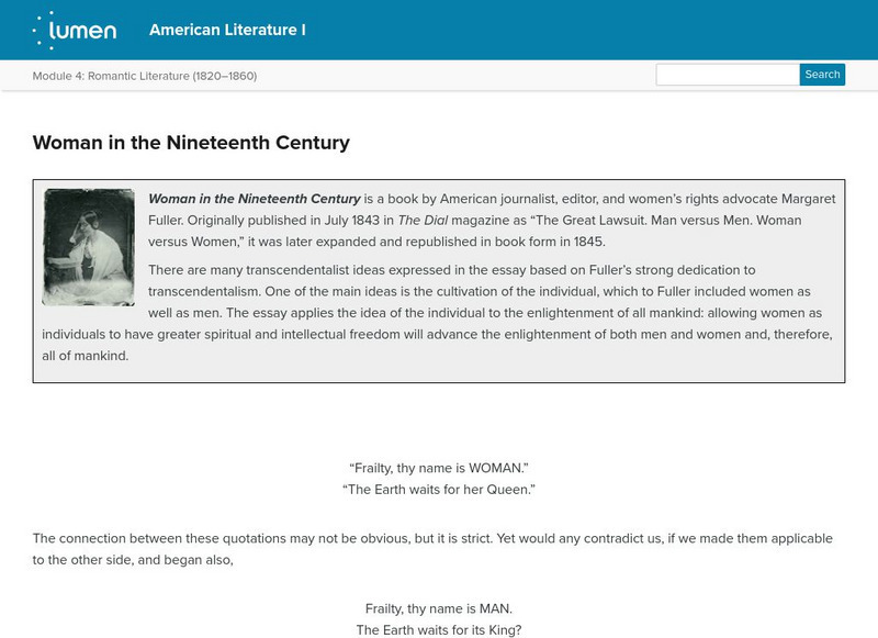 This is a text excerpt and a link to the full-text audio of Woman in the Nineteenth Century by Margaret Fuller. The essay applies the idea of the individual to the enlightenment of all mankind: allowing women as individuals to have...