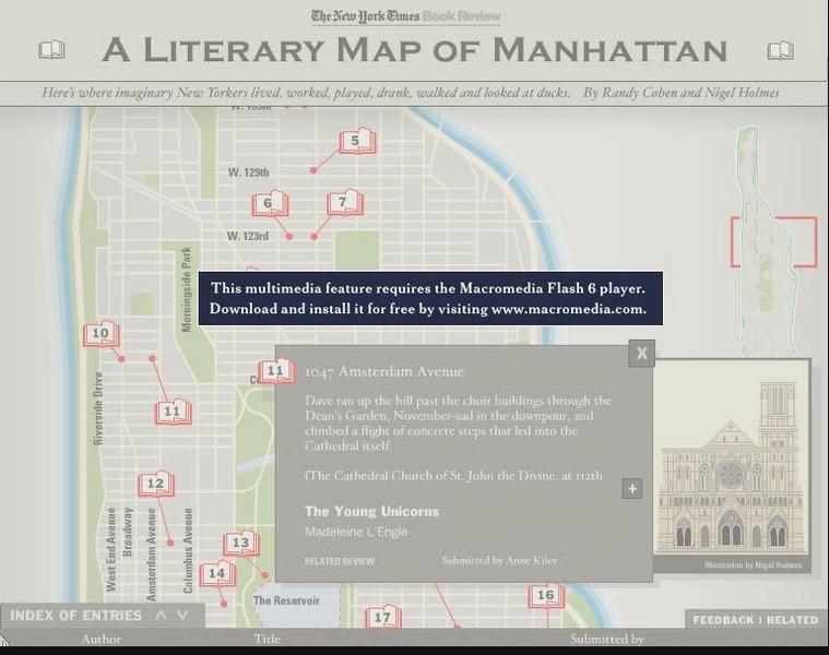 Explore Manhattan through the words of great literature. Scroll down the map or click on the book icons to find a quotation that relates to a specific address in New York. Many of the quotations are accompanied by portraits of the...