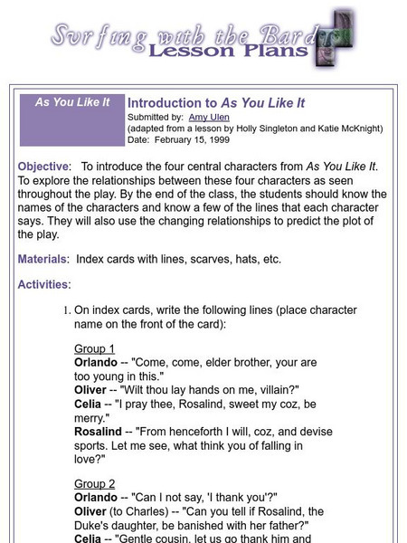 Delve into the world of Shakespeare's "As You Like It" when you visit this lesson plan. This lesson plan focuses on introducing you to the four central characters.