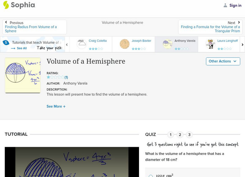 This lesson will present how to find the volume of a hemisphere. Student watch a video tutorial and then can take an online quiz.