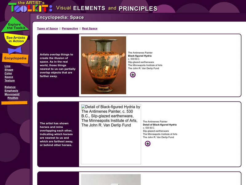 An interactive site that explores the elements and principles of visual art through the artist's toolkit. This entry from the artist's encyclopedia on space includes information on types of space, real space, and perspective.