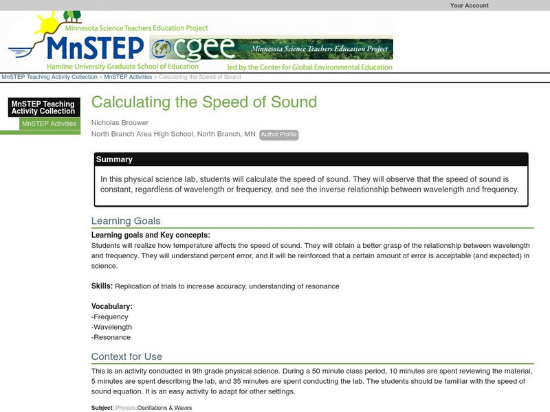 In this physical science lab, students will calculate the speed of sound. They will observe that the speed of sound is constant, regardless of wavelength or frequency, and see the inverse relationship between wavelength and frequency.