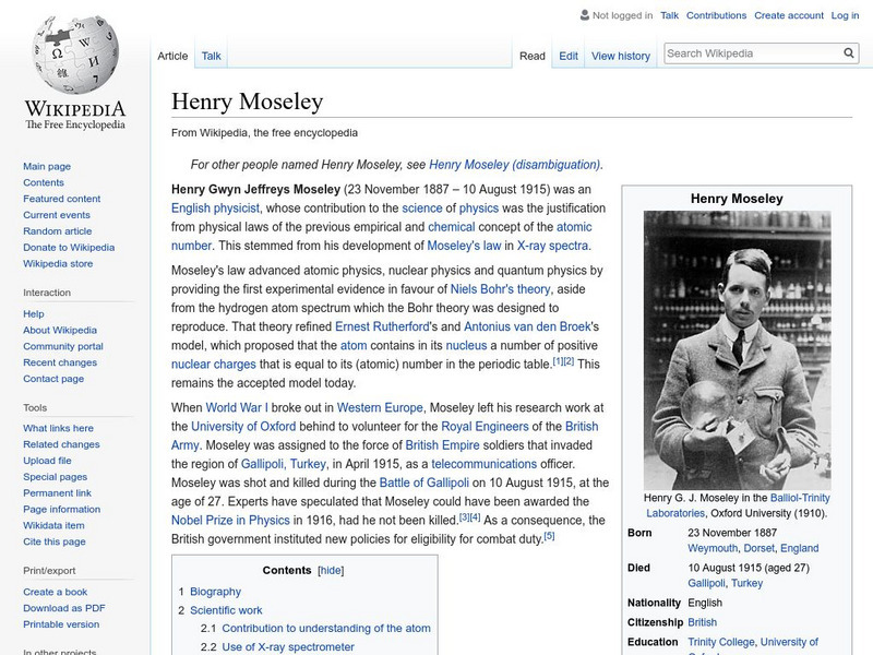 This site from the Wikipedia Encyclopedia provides an overview of the life of scientist Henry Moseley. This open-source encyclopedia site discusses his contribution to science and how he found a systematic relation between wavelength and...