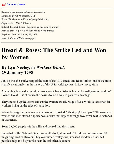 An article from Workers World describes the Bread and Roses Strike and explains why it ended up to be so effective. One interesting aspect is that there were immigrants working in the Lawrence textile mills speaking 25 different...