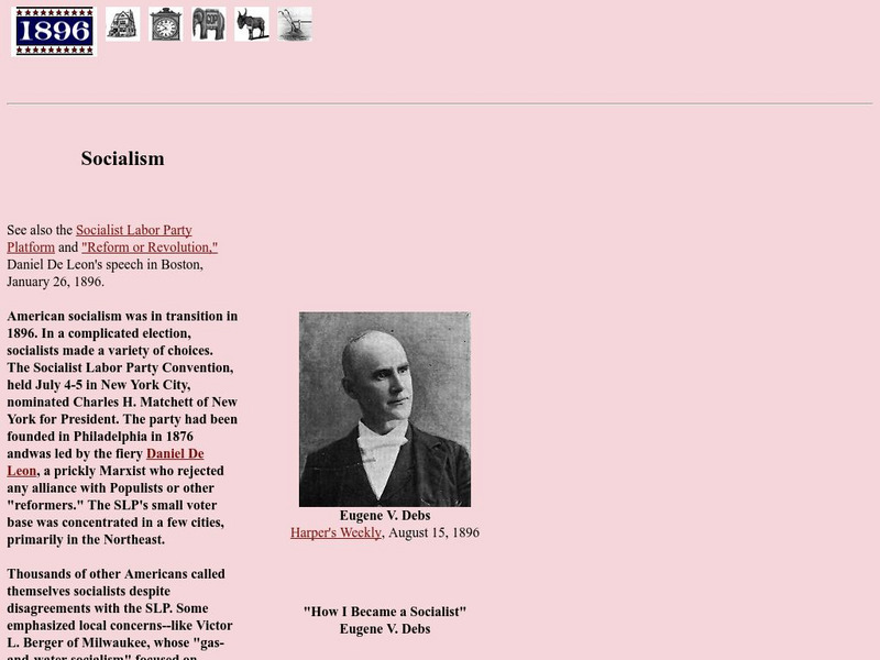 This website from Vassar College for Political Cartoons offers a look at Socialism in 1896 with special attention to the thoughts of Eugene V. Debs.