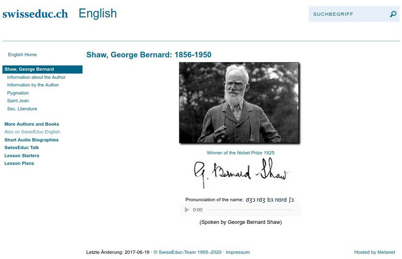 The site from SwissEDUC has a portrait of the writer, as well as audio of Shaw speaking about pacifism and a video of a biography, "A 1930 Newsreel Appearance." Equally important is a the information on "Pygmalion." It provides...