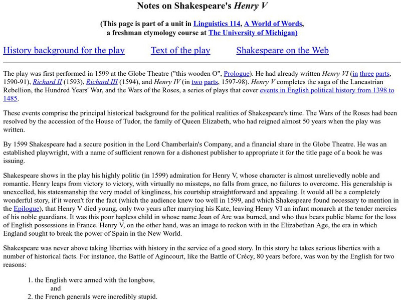 This site from the University of Michigan provides notes on Shakespeare's "Henry V"; includes general information concerning the play and William Shakespeare, history background for the play, text of the play, and Shakespeare on the Web.