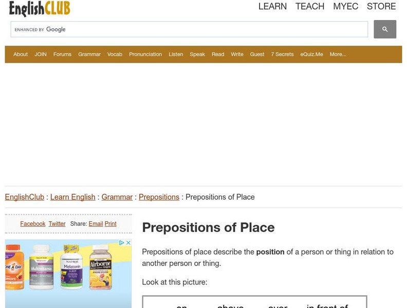 A graphic and example sentences to demonstrate how some prepositions show position or place.