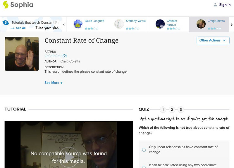 The concept of constant rate of change is described in this video tutorial. The lesson demonstrates how to determine the rate of change from a table and create a graph. Includes short quiz. [4:02]